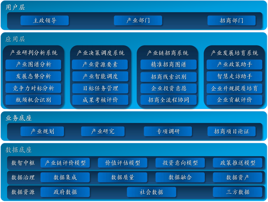 精準(zhǔn)招引、體系評估、統(tǒng)籌流程。從產(chǎn)業(yè)鏈視角出發(fā)結(jié)合產(chǎn)業(yè)模型,以補(bǔ)鏈和延鏈為核心,通過強(qiáng)大的數(shù)據(jù)處理能力與業(yè)務(wù)研究能力,對全國范圍內(nèi)的企業(yè)、項目、人才進(jìn)行識別與評估,為招商部門明確招引產(chǎn)業(yè)環(huán)節(jié),招引企業(yè)清單。幫助招商部門確定招什么產(chǎn)業(yè)環(huán)節(jié)、招那些企業(yè)、怎么招的問題,并打通招前、招中、招后環(huán)節(jié),全面深入賦能產(chǎn)業(yè)招商工作。