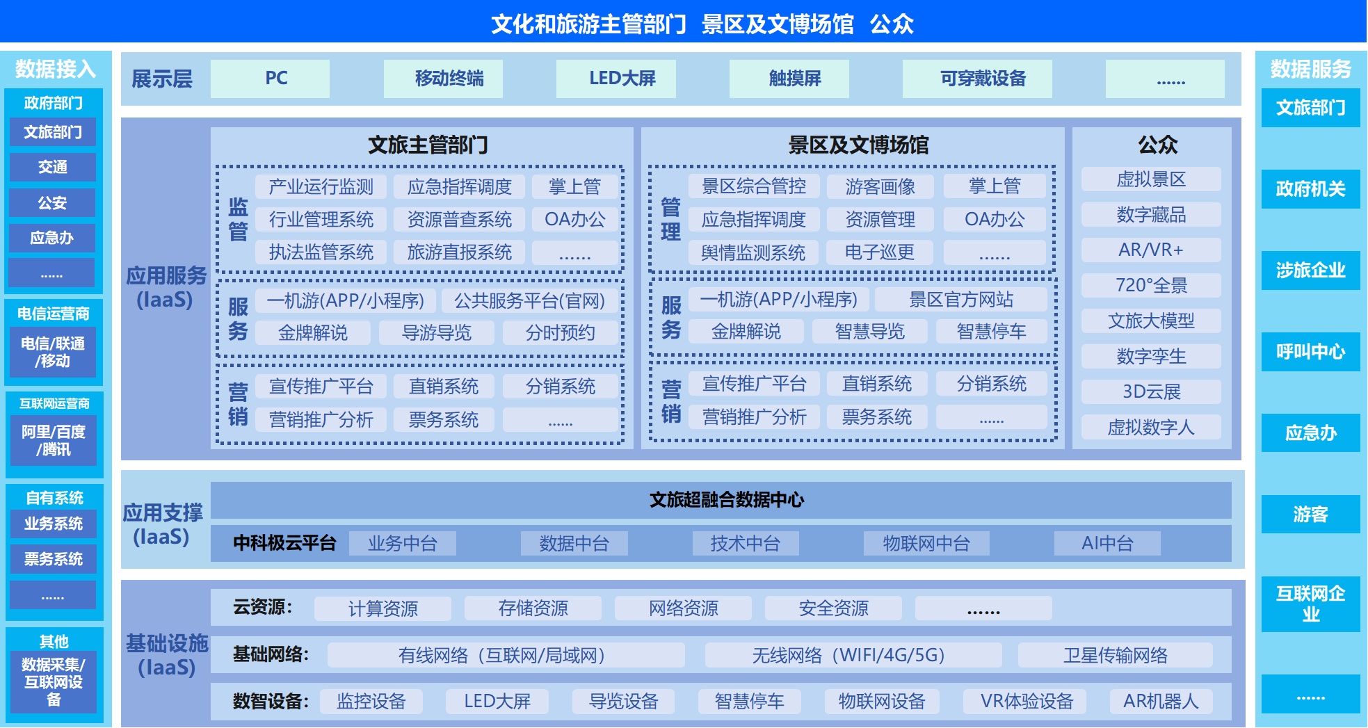 為解決文旅數(shù)據(jù)融合難、業(yè)態(tài)多監(jiān)管難、資訊發(fā)布渠道雜亂、游客體驗差等問題,中科信息以Al、大數(shù)據(jù)、物聯(lián)網(wǎng)等基礎(chǔ)產(chǎn)品為支撐,以應(yīng)用場景為抓手,聚焦文旅融合創(chuàng)新,為政府、景區(qū)、文博場所等提供全流程服務(wù)和管理的解決方案,覆蓋基礎(chǔ)設(shè)施建設(shè)、文旅大數(shù)據(jù)、智慧服務(wù)、智慧管理、智慧運營等應(yīng)用場景,實現(xiàn)管理智能化、服務(wù)一機化、營銷深入化,從而促進文旅融合發(fā)展,全面支撐文旅監(jiān)管決策,提高旅游公共服務(wù)質(zhì)量。